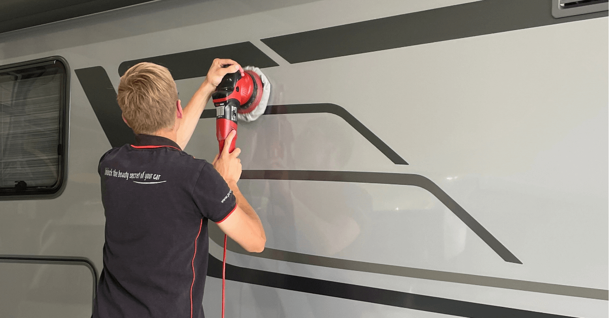We starten altijd met een grondige wasbeurt van de mobilhome. Voor de lak gebruiken we de autoshampoo van ProTech en de velgen nemen we onder handen met de velgenreiniger. Bij gebruikte campers polijsten we de lak volledig zodat kleine krasjes en eventueel doffe plekken verdwijnen.