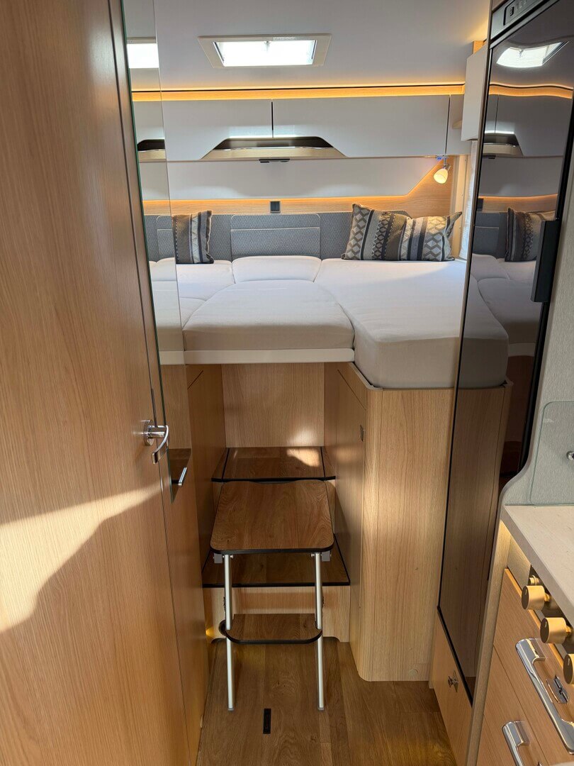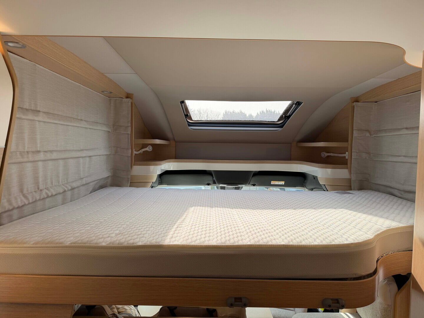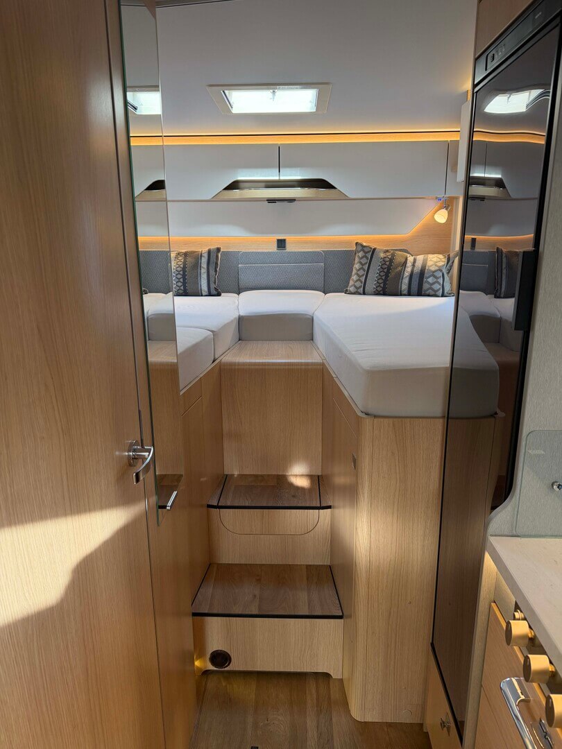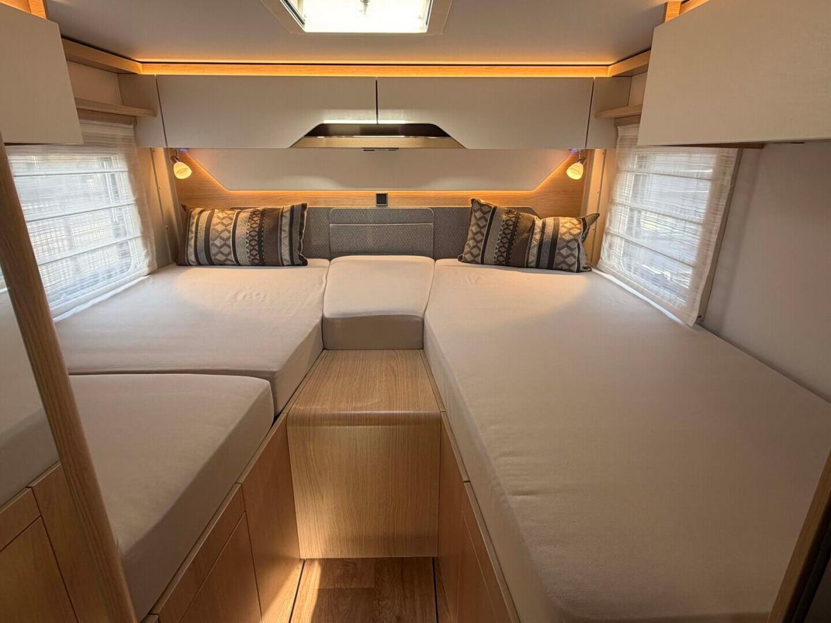 - Elektrisch neerlaatbaar tweepersoonsbed boven de zitgroep met koudschuimmatras incl. dakintegratie