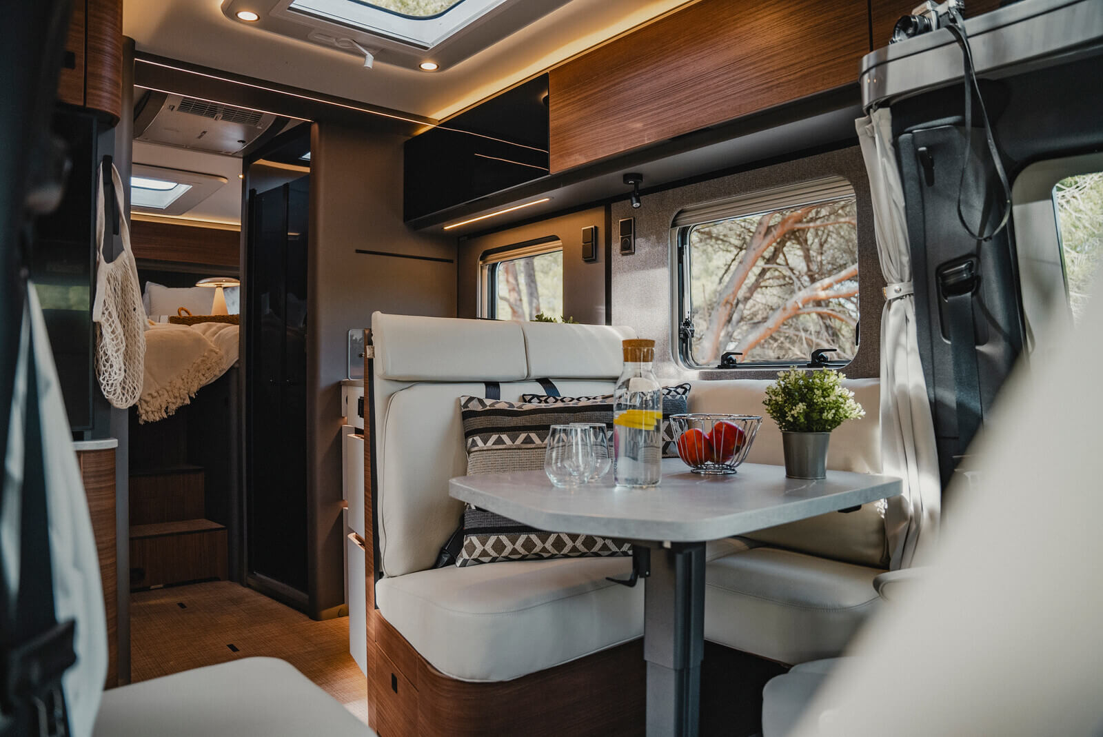 - Comfort L-zitgroep met loungebekleding, in lengte-/breedte verschuifbare tafel en 2 geïntegreerde 3-punts gordels