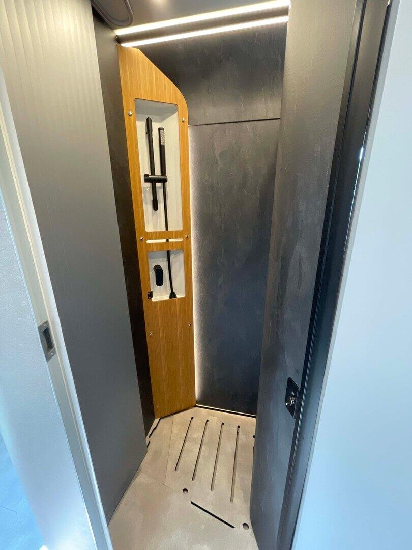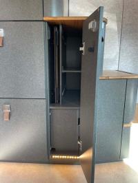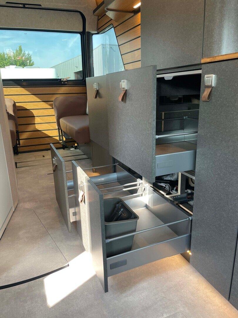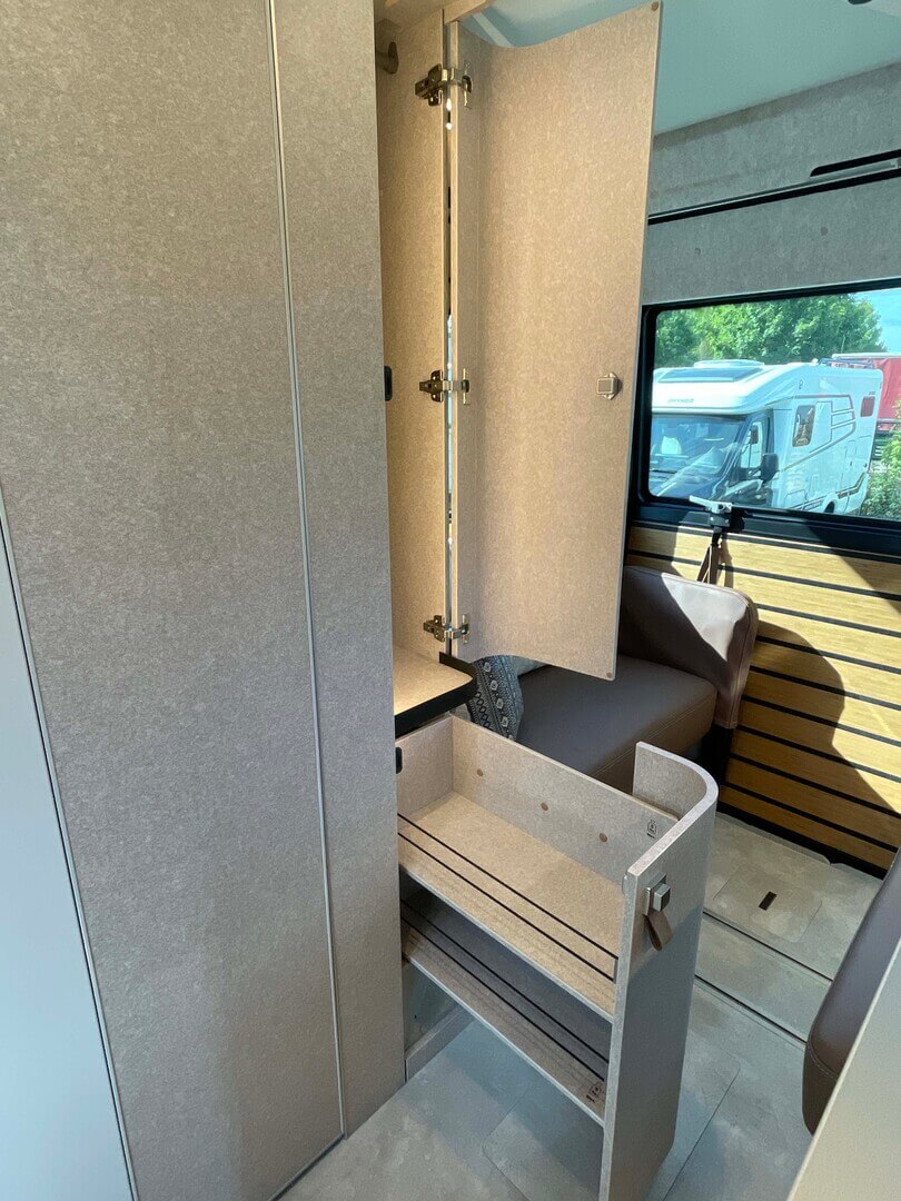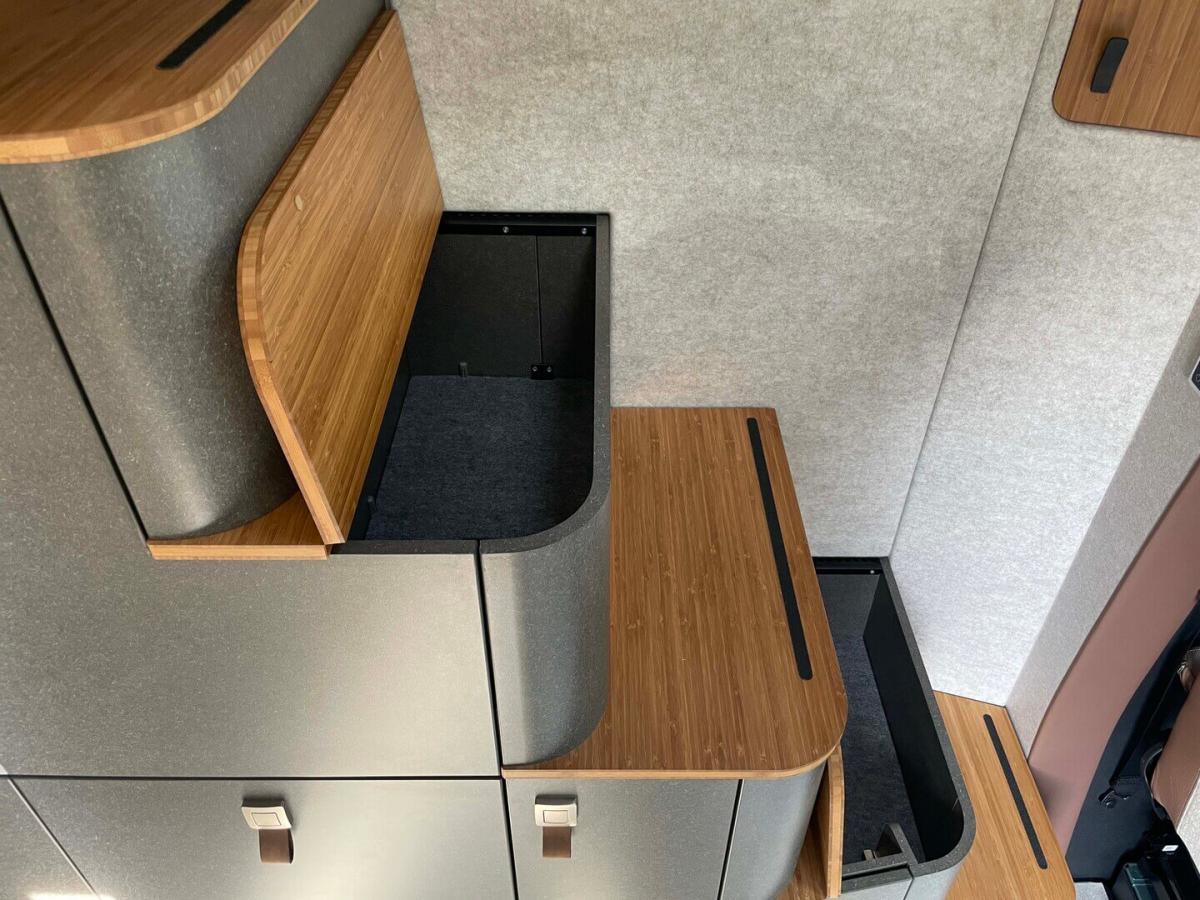 - Opbergsysteem in de cabine met vilten afwerkbakken